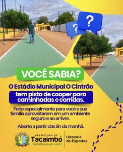💡 VOCÊ SABIA? O Estádio Municipal O Cintrão é mais do que futebol! Ele conta com pista de cooper, pensada especialmente para quem ama caminhar, correr e cuidar da saúde 🏃♀️🚶♂️ É um espaço seguro, ao ar livre e acessível, perfeito para você e sua família incluírem mais movimento na rotina, melhorarem a qualidade de vida e aproveitarem momentos de bem-estar desde cedo. ⏰ Aberto a partir das 5h da manhã, o Cintrão incentiva hábitos saudáveis e fortalece o esporte como ferramenta de cuidado com a população tacaimboense. 👉 Aproveite, movimente-se e cuide de você! Prefeitura de Tacaimbó – Trabalhando por você. 💛💙