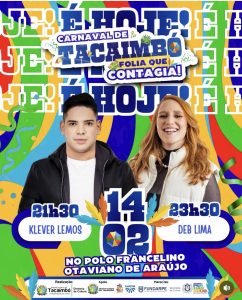 🎊 O DIA MAIS ESPERADO CHEGOU! 🎊 Pode separar o look e preparar o gogó, porque os shows do Carnaval de Tacaimbó – Folia que Contagia entra em cena HOJE! A energia está acumulada e a gente não vê a hora de encontrar todo mundo no Polo Francelino Otaviano de Araújo. 🚀 Confira o nosso line-up de hoje e não perca o horário: 21h30 – Klever Lemos 🎙️ 23h30 – Deb Lima 🔥 Vem viver essa alegria com a gente! Chame os amigos, vista seu melhor sorriso e vamos fazer história em mais uma noite de folia inesquecível. 📍 Onde: Polo Francelino Otaviano de Araújo #Carnaval2026 #FoliaQueContagia #KleverLemos #Deblima #Tacaimbo