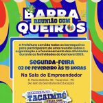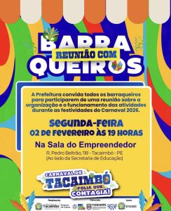 🎭✨ REUNIÃO COM BARRAQUEIROS – CARNAVAL 2026 ✨🎭 A Prefeitura de Tacaimbó convida todos os barraqueiros para uma reunião importante sobre a organização e o funcionamento das atividades do Carnaval 2026. 🗓 Segunda-feira, 02 de fevereiro ⏰ Às 19h 📍 Sala do Empreendedor – R. Pedro Beltrão, 118 (Ao lado da Secretaria de Educação) Será um momento de alinhamento, orientações e esclarecimento de dúvidas para que possamos realizar um carnaval organizado, seguro e cheio de alegria para todos. Carnaval de Tacaimbó – Folia que contagia! 🎉🎶