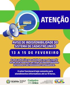 ​A Prefeitura de Tacaimbó informa que o Sistema do Cadastro Único estará indisponível entre os dias 13 e 15 de fevereiro.