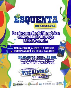 🎉 O CARNAVAL JÁ ESTÁ COMEÇANDO POR AQUI! 🥳 Coração batendo no ritmo da orquestra? Então se prepara que HOJE tem o nosso Esquenta de Carnaval! Vamos juntos dar o play na folia com muita música, tradição e solidariedade. Confira a programação: 🎶 Ensaio com a Banda Filarmônica ✨ Ornamentação da Praça 🥤 Batida e cuscuz para a galera! 📍 Onde: Praça Francelino Otaviano de Araújo 🕖 Horas: A partir das 19h 🎁 SOLIDARIEDADE: Não esqueça! Traga 2kg de alimento não perecível e garanta o seu abadá do Bloco TacaFest. Prefeitura de Tacaimbó – Trabalhando por você! 💙💛 #CarnavalTacaimbó #Esquenta #TacaFest #Cultura #Pernambuco