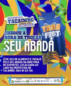FALTA MUITO POUCO! O CARNAVAL JÁ VAI COMEÇAR! 🥁🔥 O coração já bate no ritmo do frevo e a energia está lá no alto! O Carnaval de Tacaimbó está prestes a ganhar as ruas, mas a pergunta é: você já está com o seu abadá na mão? Não deixe para o último segundo! Corra até a Diretoria de Esportes (ao lado da Prefeitura) com 2kg de alimentos e garanta o seu abadá do TacaFest. 📍 Das 8h às 13h. Vem com a gente, porque a folia que contagia já vai começar! 🎭✨