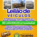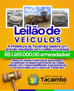 Mostrando transparência, responsabilidade e respeito com o dinheiro público, a Prefeitura de Tacaimbó comemora o sucesso do Leilão de Veículos Municipais, que arrecadou o valor expressivo de R$ 1.165.000,00! 👏👏